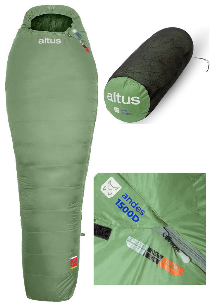 Saco de dormir Altus Andes 1500 color Laurel, diseñado para alta montaña y condiciones de frío extremo. Incorpora relleno de pluma 90/10 de alto poder térmico, diseño tipo momia y peso ligero de aprox. 1,5 kg, garantizando máximo aislamiento, confort térmico hasta −12 °C, temperatura límite de -20 ºC, temperatura extrema -44 ºC y gran compresibilidad. Ideal para trekking invernal y expediciones técnicas.
