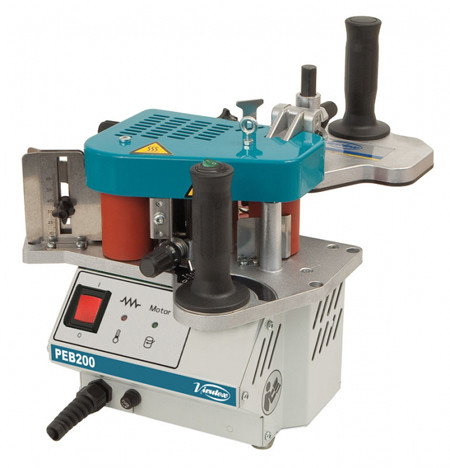 Aplacadora de cantos portátil de cola caliente PEB200 de Virutex. Aplaca cantos de PVC, ABS, melamina, estratificados o madera, previamente cortados a la longitud deseada, sobre paneles rectos, redondos y con formas.