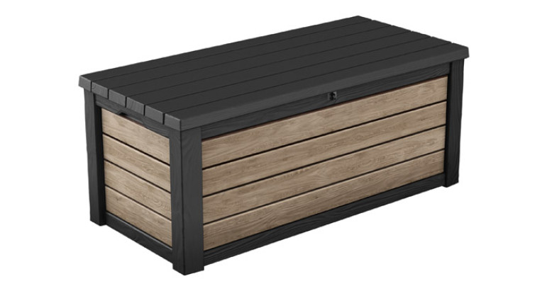 Arcón ordenación exterior. Imitación madera. Sistema de apertura con pistones metálicos. Cómodo asiento par dos adultos. Dispone de asas y ruedas para fácil transporte.