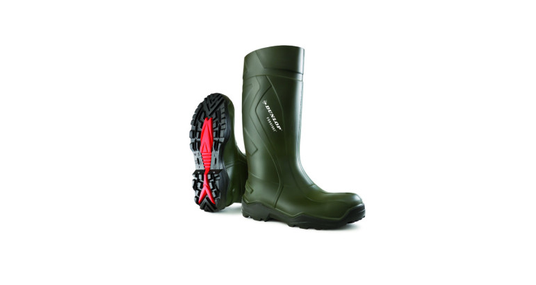 Bota ligera para prevenir el cansancio de los pies. Material PUROFORT. Verde. Forro rojo. Suela de PU Dunlop Premium negra. Antideslizante. Normas de seguridad Europa: EN ISO 20347:2022+A1:2024 O4 CI SR FO