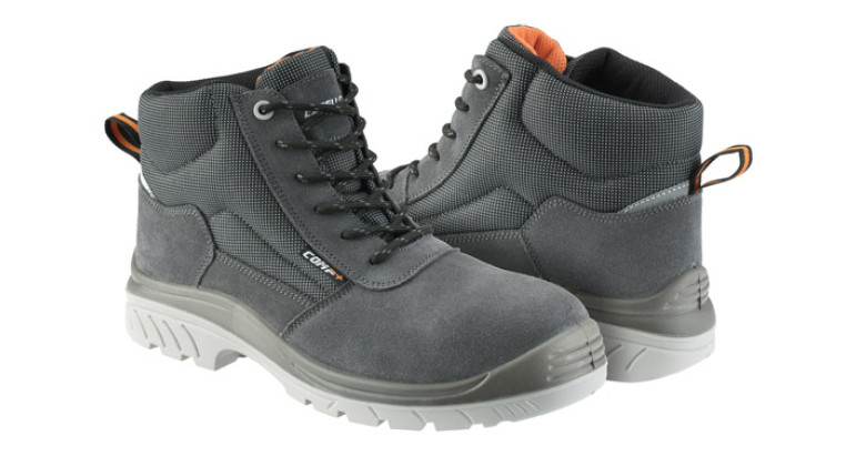 Bota de seguridad Comp+ S1P, con plantilla antiperforación textil y puntera de fibra de vidrio, en serraje gris transpirable, con suela