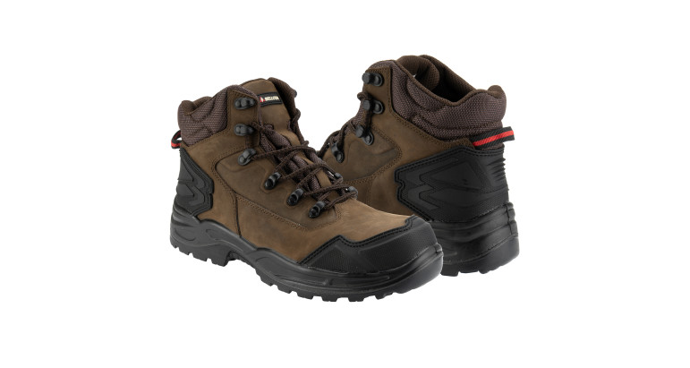 Bota de seguridad fabricada en piel crazy horse de alta calidad con tratamiento hidrófugo repelente al agua. Suela de poliuretano PU+PU de doble densidad con enfranque y taqueado sobredimensionado para máximo agarre en terrenos irregulares, con certificación antideslizamiento SR.