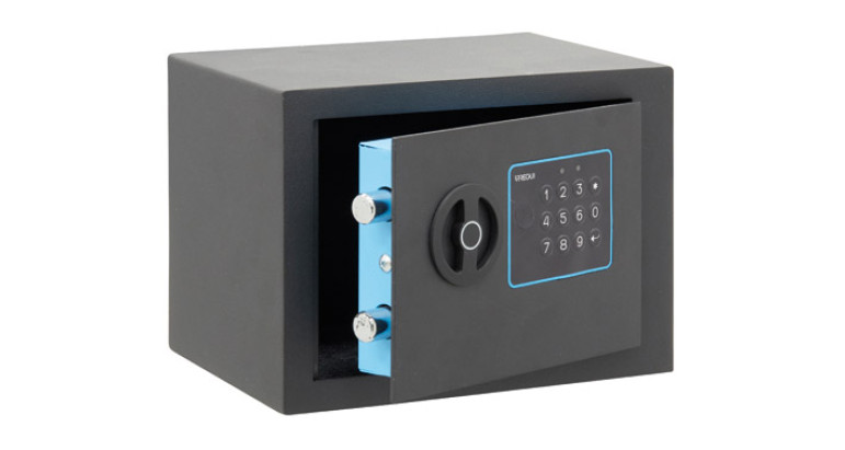 Caja fuerte BLUE de sobreponer en color grafito, con apertura mediante código electrónico y pomo. Dispone de 2 códigos de apertura de 3 a 8 dígitos y función máster. Espesor frente 3 mm con corte láser, y cuerpo de 1,5 mm. Cierre mediante 2 bulones de 16 mm de diámetro. Llave de emergencia.