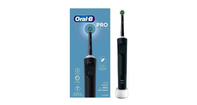 El cepillo de dientes eléctrico recargable Oral-B Vitality Pro ofrece una limpieza clínicamente probada más intensa que un cepillo de dientes manual normal. Incluye 3 modos de cepillado: Limpieza diaria, Sensible y Sensible Plus, para una experiencia increíblemente suave.