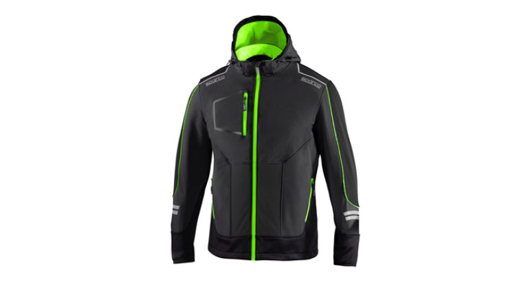 Peso: 330g gr/m². Composición: Exterior 93 % poliéster, 7% spandex. Interior 100% poliéster (polar Fleece). Especificaciones: Inserciones de refuerzo en hombros y mangas fabricadas en material antiabrasión. Bandas reflectantes de alta visibilidad en las mangas. Capucha demontable y plegable con doble ajuste. Puños elásticos.