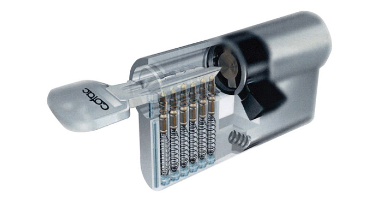Cilindro de seguridad, de llave reversible de puntos y seis pitones. Este cilindro incorpora protecciones anti-taladro, anti-bump y anti-ganzúa. Se comercializa con pitonaje de alpaca lo que proporciona una durabilidad superior a 100.000 ciclos.