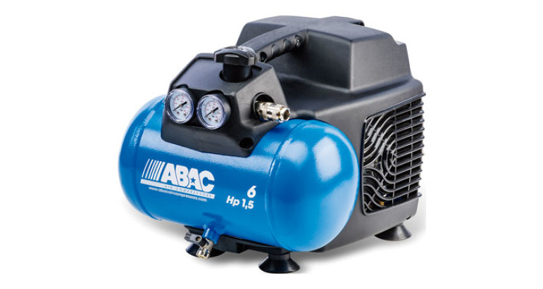 Compresor sin aceite ABAC Serie LINE. 1,5HP, depósito 6 lts, 180 lts/min., 8 bar, monofásico, 68dBA. Indicado para uso bricolaje y trabajos profesionales con clavadoras-grapadoras. Ergonómico y compacto. Incluye enrrollador de cable eléctrico integrado