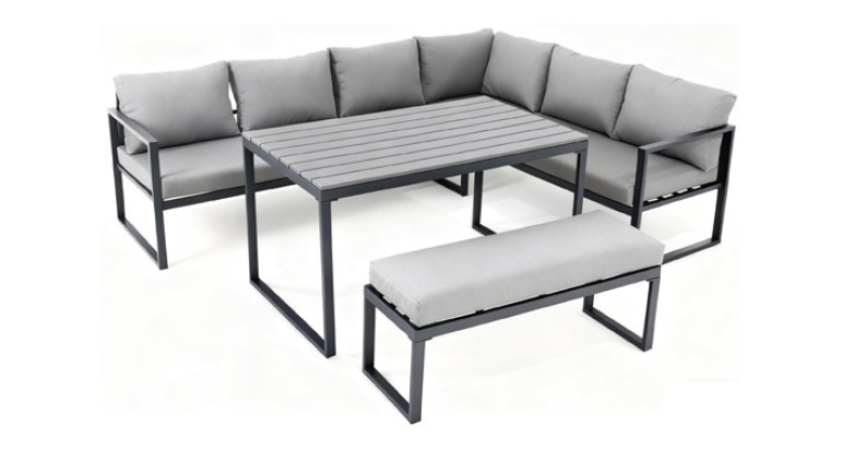 Estructura de acero color gris antracita y cojines de poliéster de color gris de 200 gr/m2 y 10 cm de grosor. Tablero de la mesa y banco de polywood. 2 Sofás de 187x65x71 cm, banco 110x37x34 cm, mesa 130x75x68 cm.