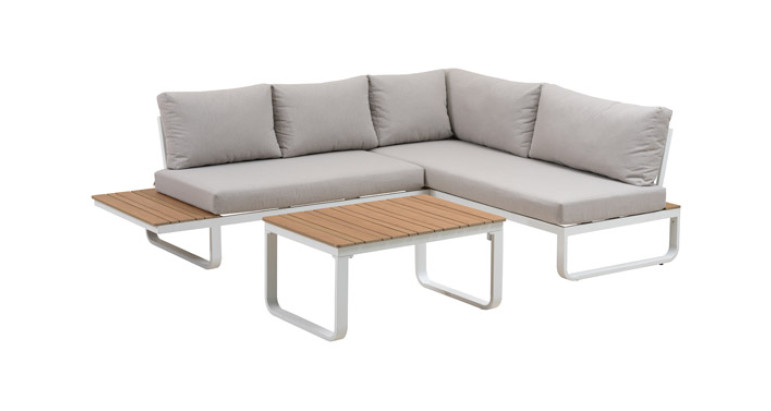 Estructura de aluminio color blanco y cojines poliéster de color arena de 10 cm. Sofá de 2 plazas 154x77xH65 cm, sofá de 3 plazas 180x77xH65 cm, mesa de centro 86x60xH42 cm con el sobre de madera plastificada.