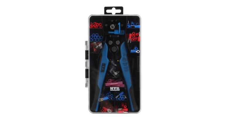 Material: crimpadora de acero A3. Mango PP+TPR. Bridas para cable de nylon. Terminales para cables de cobre.
