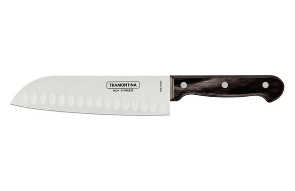 Santoku polywood castaño. Medida: 17,78 CM. Ideal para cortar, rebanar y picar. Lámina de acero inoxidable con mayor durabilidad del filo, gracias al tratamiento térmico. Mango de madera tratada Polywood resistente a impactos y altas temperaturas, lo que garantiza mayor resistencia y durabilidad. Remaches de alumínio. Se puede llevar al lavavajillas facilitando tu día a día.