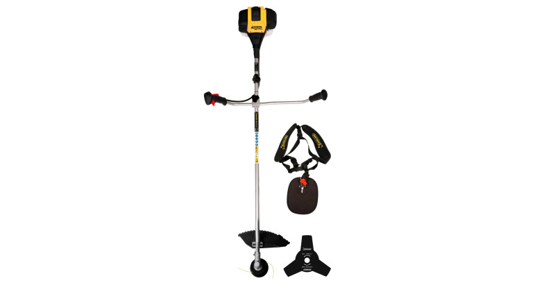 Cilindrada 42,7 cc, potencia 1,6 CV. Manillar plegable. Incluye arnés, disco de 3 puntas y cabezal de hilo.