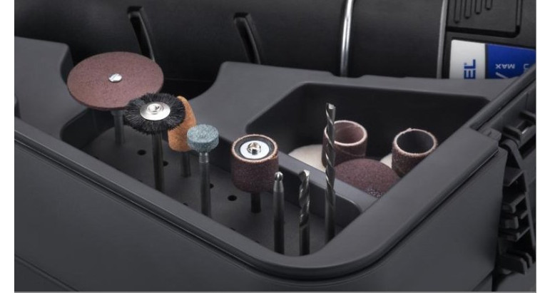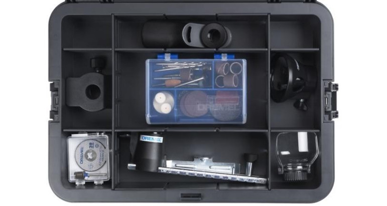 Gama completa de accesorios y complementos. Incorpora dos baterías de 12 V y 2 Ah para disfrutar de un uso prolongado. Con nada menos que 65 accesorios, entre los que se incluyen el SpeedClic, podrás llevar a cabo trabajos de primer nivel de tallado, grabado, amolado, lijado, limpieza, pulido, corte, así como otras aplicaciones, con una precisión milimétrica. Obtendrás cinco complementos (empuñadura de detalle, complemento de protección, plataforma de moldeadora, cortadora lineal y circular y guía de corte multifunción) para que puedas disfrutar del máximo control, seguridad y nivel de detalle. Este kit viene en una Dremel Box, un sistema versátil de almacenaje diseñado para adaptarse a tus necesidades en materia de organización. Con los separadores ajustables, podrás disponer el interior para guardar tus herramientas, accesorios y complementos como a ti te guste. El kit incluye dos cajas apilables para apilarlas con seguridad y ahorrar espacio o usarlas por separado para una organización más específica. Gracias al asa integrada, te podrás llevar tus herramientas allá adonde tus proyectos te lleven.