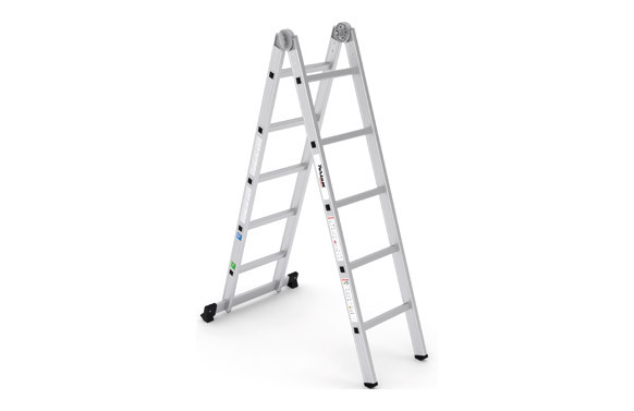 5+5 peldaños. Escalera de aluminio con dos posiciones de trabajo, extendida y tijera. 3,5m extendida y 1,51 a tijera. Fabricada según norma UNE 131.