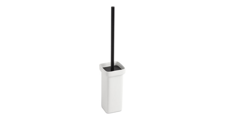 Escobilla baño Nero fabricada en acero inoxidable de color negro mate con recipiento de cerámica blanco.