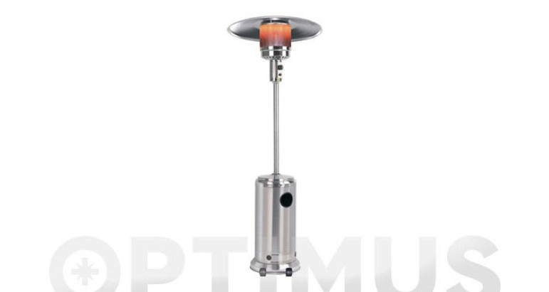 Estufa exteriores c/monomando. Cuerpo en acero inoxidable. Potencia 9-15kw. Sombrero ø 80 cm. Equipa ruedas. Monomando y sistema de seguridad anti-vuelco. Altura máxima: 2\'20 m. Área irradiada 25 m2. Reguladory manguera no incluidos. Uso exterior.