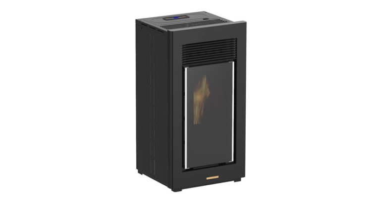 Estufa de pellets auto-limpiante de 11kw negra. Potencia termoquímica 11,7kw. Carga pellet con sistema anti-atascos tornillo estelar. Eficiencia: 88-93%. Depósito de 19kg. Consumo: 1-2,4 kg/h. Medidas: 100x49,6x56cm. Wi-fi opcional.
