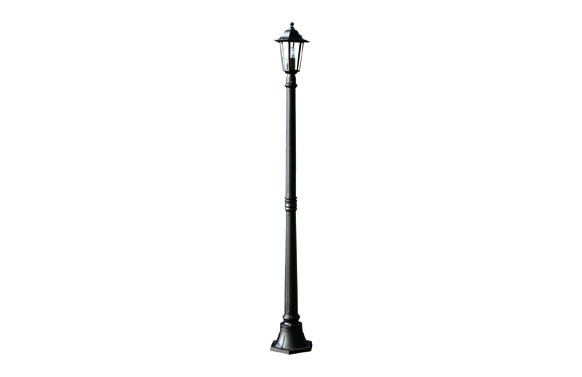 FAROLA ORLANDO Aluminio y cristal, 6 caras, casquillo E-27, 60W, IP44. Altura 1,7m. Bombilla no incluida. Negro.