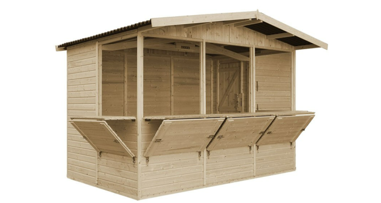 KIOSKO DE MADERA CON SUELO. Medida 300x200 cm y alto 232 cm. Superficie 6 m². Tablones de madera de 17 mm xde espesor. Ventana y puerrta con cerradura.