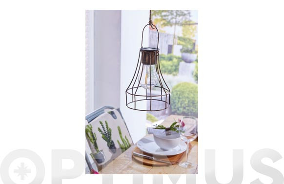 LÁMPARA DECORATIVA SOLAR LED DORTMUND Material: metal con bombilla de plástico. Acabado cobre antiguo. 2 LEDs en forma de filamento. Ø13x16cm.