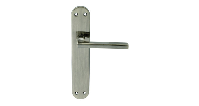 Juego de manilla con placa ligera y elegante, realizada en aluminio/acero, modelo 606 NS, que incluye placa 240x45mm. Acabado niquel satinado. Largo manilla 120 mm.