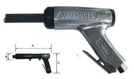 Martillo neumático de agujas Nitto N-JC16 tipo pistola. Las agujas del martillo se adaptan al contorno de la superficie que se está trabajando. Se puede utilizar para eliminar oxidos, hormigón en herramientas de obra, quitar pintura o eliminar sobrantes de soldadura.