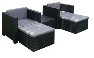 2 SILLONES + 2 POUFS + MESA BAJA. Estructura de ratán plano de resina color gris antracita, incluye cojines color gris . 2 sillones de 72 x 65 x 74 cm, 2 poufs de 39 x 57 x 57 cm, mesa de 34 x 57 x 57 cm.