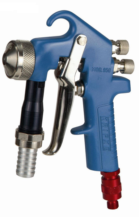 Pistola por presion 950-G de KRIPXE. Pistola especial para gotele y pinturas densas creada especialmente para trabajos de gran produccion con tanque de presion. Especial para grandes superficies, su nuevo sistema permite que sea la mas efectiva del mercado en la proyeccion del producto. Cuerpo pistola de duraluminio con recubrimiento especial de ptfe para una facil limpieza y mantenimiento. Boquilla de color y aguja de color en acero inoxidable de alta resistencia.