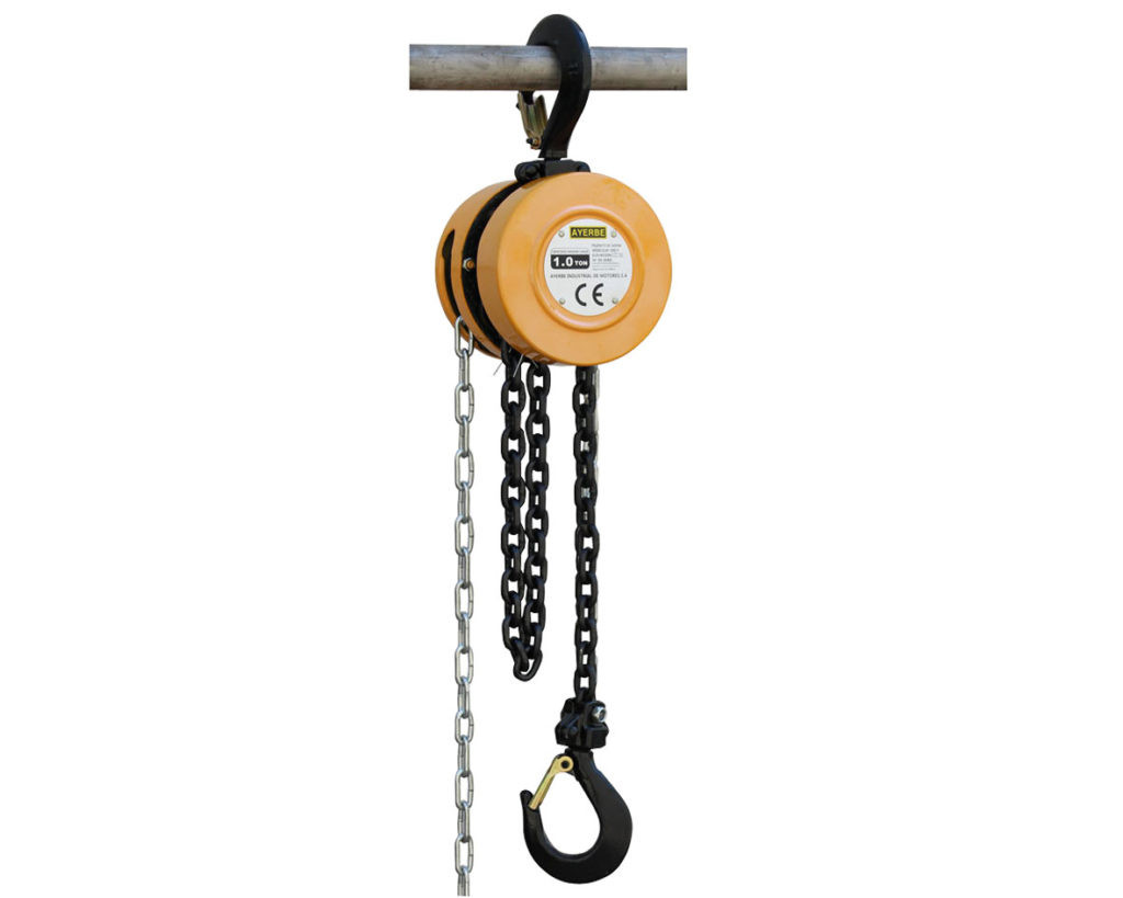 Polipasto de cadena Ayerbe AY-1000-P para uso no profesional. Tiene una capacidad de carga de 1000 Kg, y una elevación maxima de 2,5 metros.