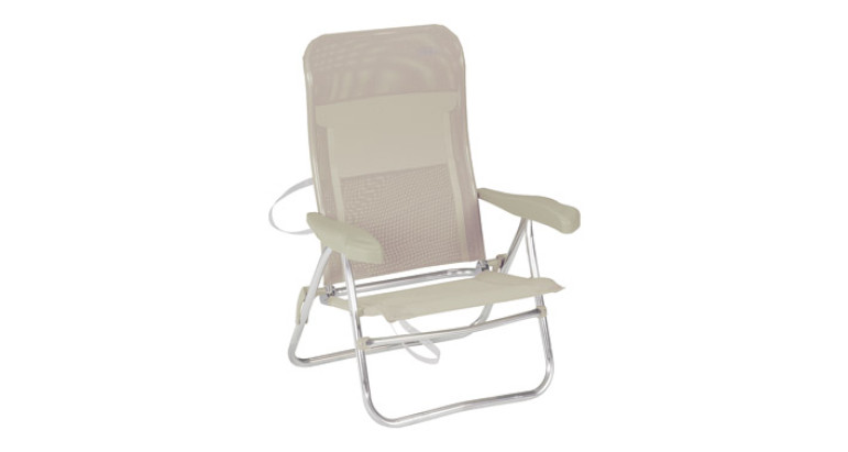 Sillón de playa fabricado en aluminio. 7 posiciones de respaldo y muy ligera, además incorpora un práctico bolsillo trasero y asas para un fácil transporte. Disponible en tejido Multifibra y Nitexli