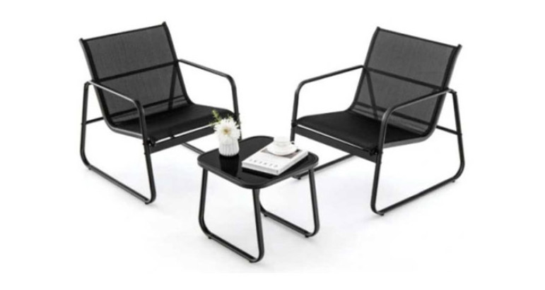 Estructura de acero y textilene color antracita. 2 sillones de 60x78x77 cm, mesa con sobre de cristal de 5mm de 45x45x42 cm.