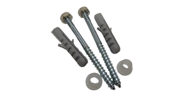 Juego de dos tornillos universales, diseñados para la fijación de inodoros o bidés verticales, junto con sus respectivos tacos.