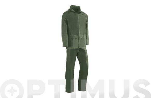 Traje de agua completo. Capucha fija interna con cierre de cremallera. Costuras termo- soldadas. Ventilación dorsal y en axilas. Puño elástico en el interior de la manga. Chaqueta con cierre frontal con cremallera y cordón ajustable. Pantalón con cintura elástica y bolsillos abiertos. 100% poliéster sobre recubrimiento de PVC de 0,18 mm. de espesor.