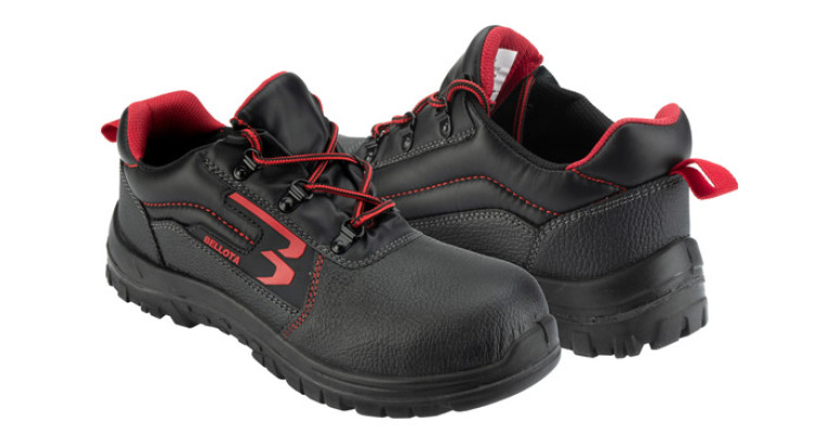 Zapato de seguridad Classic S3, con plantilla antiperforación y puntera de protección metálicas. El corte está compuesto de piel hidrófuga negra con detalles en rojo y gris. Cómodo y robusto, para la construcción y la industria.